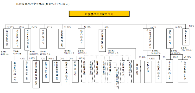 相信有在桃園生活過的人或多或少皆有聽聞過敏盛醫院,敏盛醫院成立於1975,由創辦人陽敏盛所一手創立,創立至今已二十載有餘,一直以來以大桃園做為主要經營根據,目前擁有四間醫院及二間養護中心;而盛弘醫藥成立於2003年,目前資本3.8億,董事長陽弘仁為陽敏盛之子,與敏盛體系醫院之背後最終控股公司同為敏盛醫控股份有限公司,體系圖如下表: